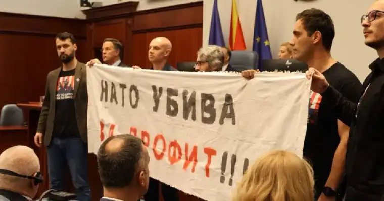 Транспарентот беше накратко изложен во салата додека траеше обраќањето. Со овој чин пратениците од Левица изразија критички став кон улогата и политиките на НАТО.