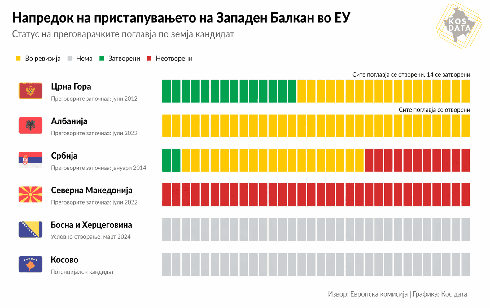 Црна Гора, која ги отвори преговорите во 2012 година, и понатаму е водечки кандидат меѓу земјите од Западен Балкан. До март 2026 година, земјата има привремено затворено 14 од вкупно 33 поглавја, а неколку други се во напредна фаза. Владата постави амбициозна цел – затворање на сите преостанати поглавја до крајот на 2026 година, со можност за полноправно членство до 2028 година.